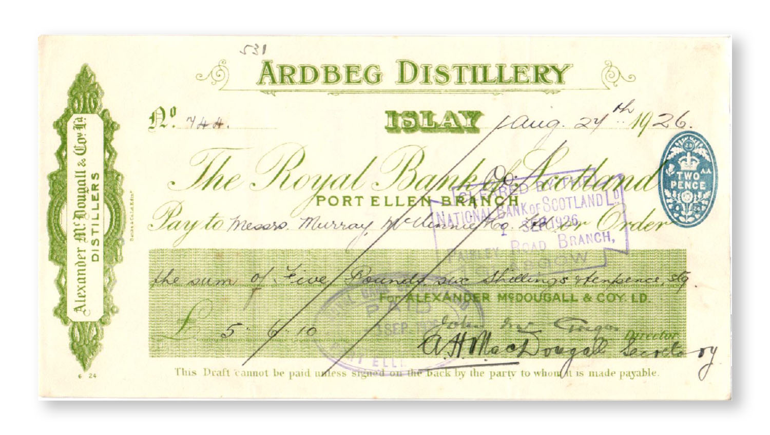 Alexander McDougall & Co Ltd may be the name on the cheques, however the last of the McDougall’s had passed away in 1953 and it was just their name that was left. The license to the distillery passed to Colin Hay, who trained his son in the art of distilling in time for Colin the younger to inherit the license in 1900. Although the lease to the Ardbeg farm itself is understood to have changed hands in 1922, Colin E Hay remained in charge, as evidenced by his signature on many of the cheques.