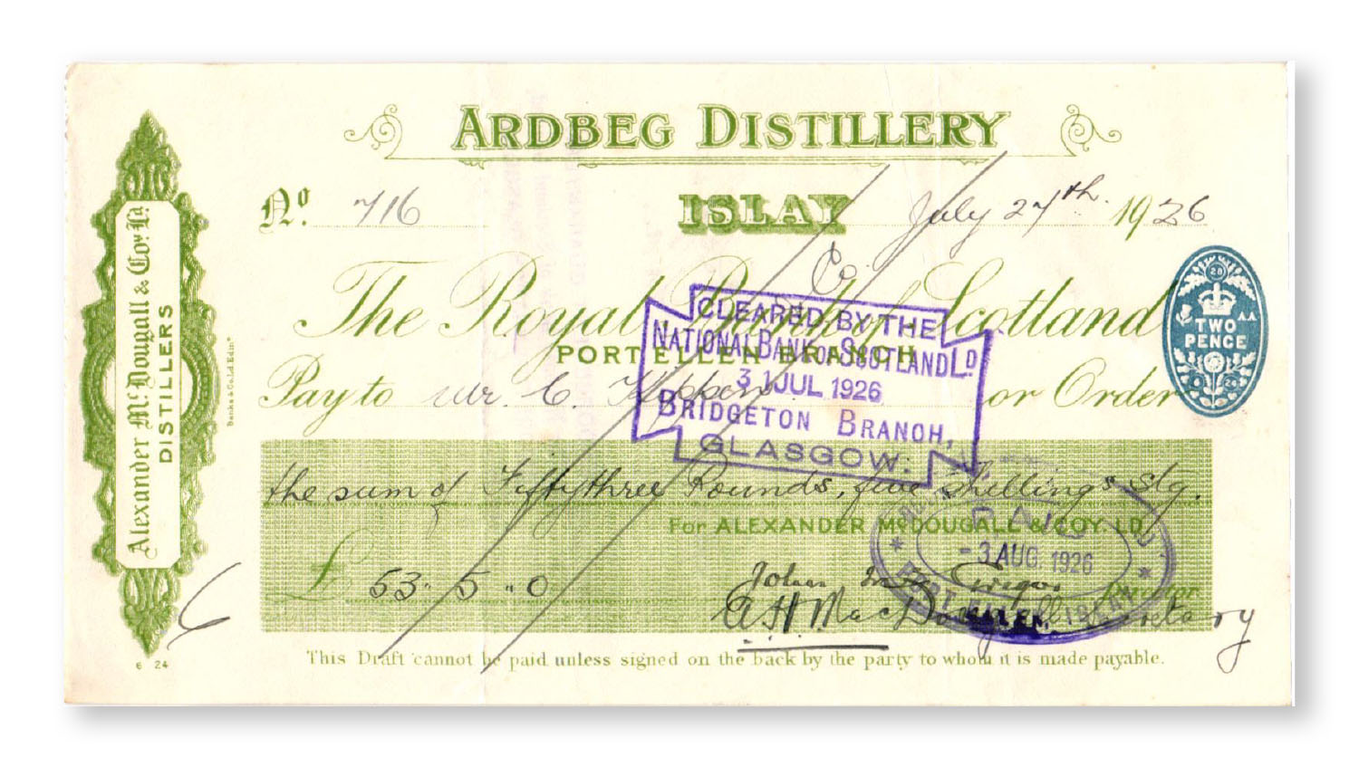 Alexander McDougall & Co Ltd may be the name on the cheques, however the last of the McDougall’s had passed away in 1953 and it was just their name that was left. The license to the distillery passed to Colin Hay, who trained his son in the art of distilling in time for Colin the younger to inherit the license in 1900. Although the lease to the Ardbeg farm itself is understood to have changed hands in 1922, Colin E Hay remained in charge, as evidenced by his signature on many of the cheques.
