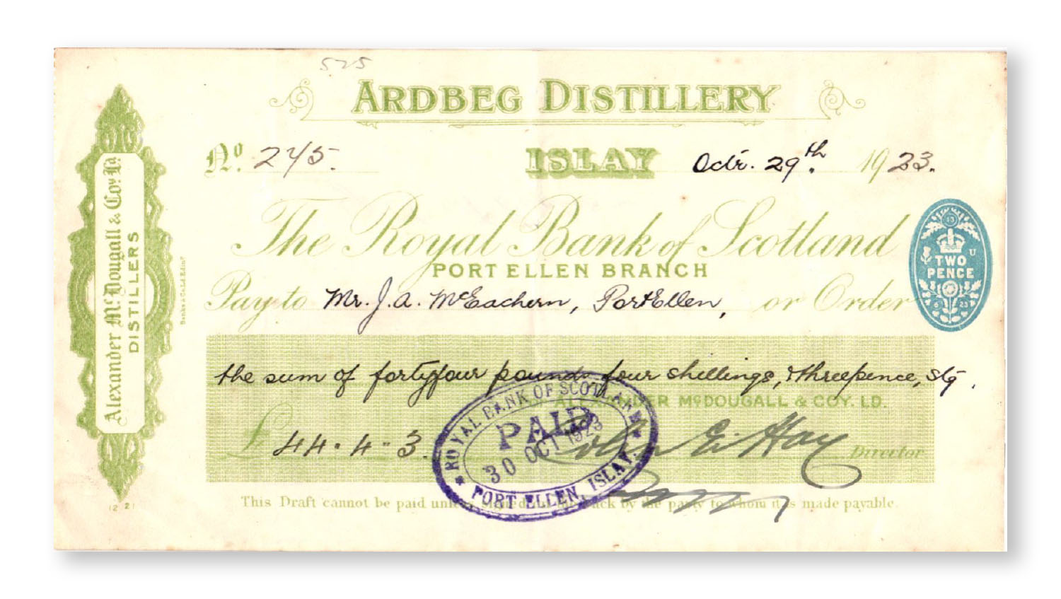 Alexander McDougall & Co Ltd may be the name on the cheques, however the last of the McDougall’s had passed away in 1953 and it was just their name that was left. The license to the distillery passed to Colin Hay, who trained his son in the art of distilling in time for Colin the younger to inherit the license in 1900. Although the lease to the Ardbeg farm itself is understood to have changed hands in 1922, Colin E Hay remained in charge, as evidenced by his signature on many of the cheques.